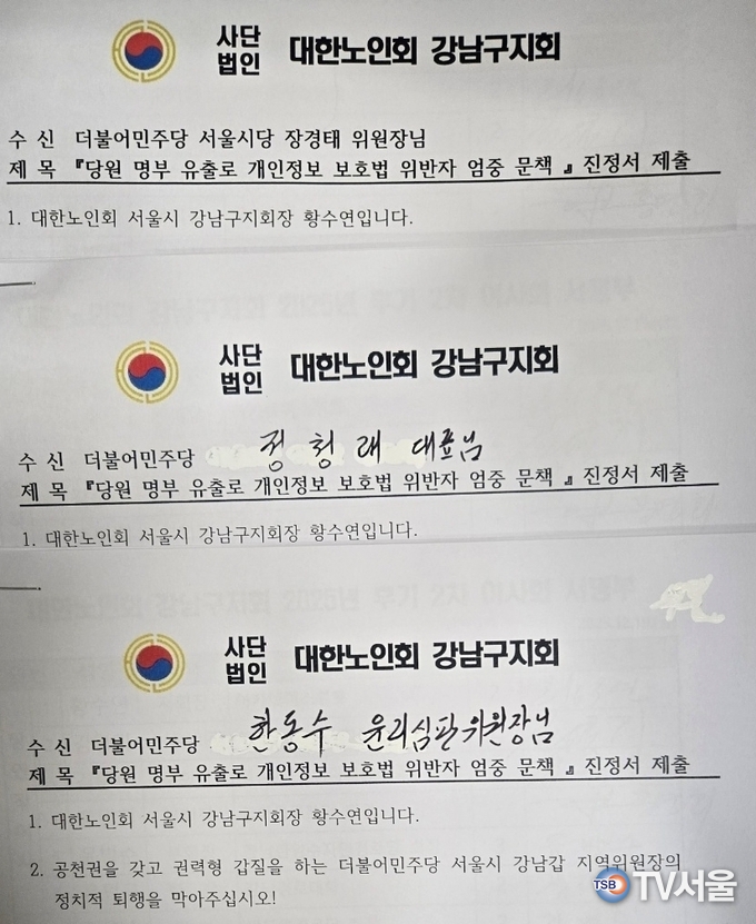 [TV서울=이천용 기자] 사단법인 대한노인회 강남구지회(회장 황수연)는 더불어민주당 강남갑 지역위원회에서 당원명부 유출이 일어난 것과 관련해 개인정보 보호법 위반자들을 엄중 문책해달라는 진정서를 민주당 중앙당 등에 제출한 것으로 확인됐다.