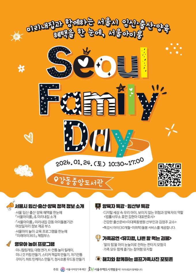 서울패밀리데이는 미리내집 입주민과 강동 지역 주민을 대상으로 서울시 임신·출산·양육 정책을 한자리에서 안내하는 서울아이(i)룸 팝업스토어로, 1월 24일 강동중앙도서관에서 열린다. 이번 행사는 미리내집 1호 단지인 올림픽파크포레온과 인근 지역 주민을 대상으로 임신·출산·양육·주거 혜택 정보를 현장에서 직접 제공함으로써, 서울시 저출생 대응에 대한 시민 인지도와 체감도를 높이기 위해 마련됐다.