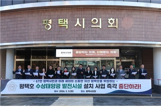 [TV서울=김수인 경기본부장] 경기 평택시의회 의원들은 3일 한국농어촌공사가 추진하는 평택호(아산호) 내 수상태양광 발전시설 설치를 즉각 중단하라고 촉구했다.