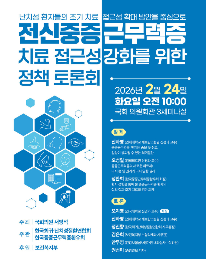 토론회를 주최한 서영석 의원은 “전신 중증근무력증은 조기 치료가 환자의 생존과 삶의 질을 좌우하는 질환임에도, 급여 기준으로 인해 치료 접근이 제한되고 있다”며 “이번 토론회가 임상적 중증도와 치료 시급성을 반영한 급여 기준 개선으로 이어지길 기대한다”고 강조했다.