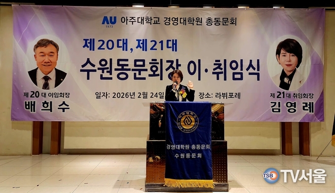 [TV서울=김수인 경기본부장] 아주대학교 경영대학원 총동문회 수원동문회(이하 수원동문회)는 지난 24일 오후 6시, 수원시 팔달구 인계동 소재 호텔라뷔포레에서 제20·21대 동문회장 이·취임식을 성대하게 거행했다. 이날 행사에는 역대 회장단과 교내 주요 인사, 지역 경제계 인사 등 200여 명이 자리를 함께하며 새 지도부의 출발을 축하했다.