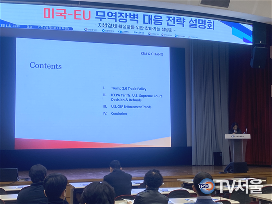 강연에서는 트럼프 행정부 관세 정책 변화와 국제무역 관련 법원의 최신 판결 동향, 글로벌 관세 환경 변화 등을 설명하고 기업의 대응 전략을 제시했다. 또한 미국 관세국경보호국의 역할과 실제 관세 집행 사례, 미국 현지 법·제도의 배경 등을 소개하며 참석자들의 이해를 돕고 글로벌 통상 환경 변화에 대응하기 위한 실질적인 실무 지식을 제공했다.