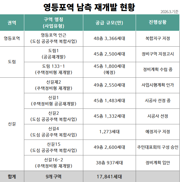 최호권 영등포구청장은 “영등포역 남측 일대의 변화는 낙후된 도시 이미지를 벗고 서울의 미래를 상징하는 명품 주거지로 거듭나는 과정”이라며 “1만 8천 세대의 대규모 정비사업이 차질 없이 진행될 수 있도록 모든 행정력을 집중하겠다”고 전했다.