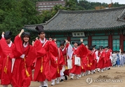 [TV서울=신민수 기자] 청년의날인 20일 서울 종로구 성균관대학교에서 열린 '2025 유소문화축제 고하노라'행사에서 참가 학생들이 임금에게 상소문을 올리는 행렬을 재현하고 있다. 성균관대학교 공식 학생단체 청랑이 주최하는 이 행사는 조선시대 성균관 유생들이 임금에게 상소를 올리던 유소 문화를 현대적으로 계승·재해석해 재현한다.