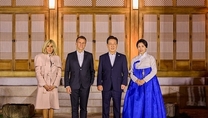 [TV서울=이천용 기자] 이재명 대통령과 김혜경 여사가 2일 청와대 상춘재에서 국빈 방한한 에마뉘엘 마크롱 프랑스 대통령과 브리지트 마크롱 여사가 친교만찬에서 기념 촬영을 하고 있다.