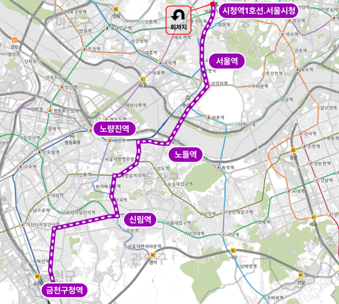 A504 노선은 평일 새벽 3시 30분에 금천구청을 출발해 신림역~노량진역~서울역 등을 거쳐 시청역까지 17.6km 구간을 1회 왕복 운행하며, 주요 정류소만 정차하는 ‘급행 방식’으로 운영된다. A504 노선은 기존 504번 시내버스와 달리 금천구청~독산고개 구간을 운행하며, 첫차 이용 빈도가 높은 주요 정류소 32개소에만 정차한다.